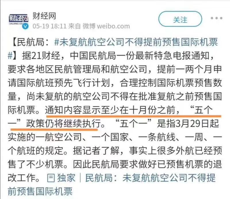 “五个一”是指3月29日起实施的一航空公司、一个国家、一条航线、一周、一个航班的规定。 随着全球各国持续复工复产,国际航班正常化亦被公众高度关注。5月19日,交通运输部部长李小鹏在国新办新闻发布会上,回应记者提问时曾表示目前民航还是实行“五个一”的政策,下一步随着疫情防控形势的发展,会不会调整、怎么调整,需咨询民航局等相关部门。 据福布斯报道,美国联合航空希望在6月份复航中国,希望开通4条航线,从旧金山到北京首都、成都和上海浦东,以及从纽瓦克到上海。美联航没有具体说明每周将飞往中国多少次,但其计划运行比中国民航局目前允许的更多的航班。 达美航空方面也希望在6月份恢复西雅图和底特律至上海的客运航班,目前还有待中国政府的批准。 此外,据韩国国际广播电台报道,韩亚航空表示,将从6月起恢复因新冠疫情暂停运行或减航的美洲、东南亚和中国等国际航线运行。其中,韩亚航空将恢复往返中国的12条航线。鉴于目前中国仍维持旅行禁令,因此恢复航班的时间可能出现变化,韩亚航空将先为复航做好准备。 不过,据上述通知介绍,近期有旅客反映,部分航空公司已经销售的航班数量远超实际可能执行的航班量,届时如果“五个一”政策没有大的变化,就会出现大量航班取消,众多已购票旅客无法成行,从而造成较多服务纠纷。 因此,通知中要求,各航空公司要继续按照“五个一”政策要求安排航班,并提前向民航局运行监控中心申请预先飞行计划。具体为:5月份申请6-7月份两个月的预先飞行计划;6月份申请8月份的预先飞行计划;7月份申请9月份计划;此后月份以此类推。 通知称,如果政策发生变化,民航局将提前通告并对审批程序作出及时调整。 此外,通知还要求,确保量力而行,合理控制国际机票预售数量。对于已经批复预先飞行计划的,要严格按照预先飞行计划进行销售。而尚未复航的航空公司,不得在批准复航前预售国际机票。 那么,对于已预售的还未复航的机票如何处理?对此,通知也作出了要求。 通知要求,切实做好已预售机票的退改工作。对于已经确认无法执行的航班,各航空公司要尽快告知旅客航班取消情况,并为其办理机票退改手续;旅客要求退票的,航空公司应提高机票退款效率,缩短退款周期。 由于疫情原因航班取消,航空货运运价集体攀升。商业航班搞不到,现在的“客改货”和包机已然成了大势。 虽然通知称会及时调整政策,但如果最坏的打算是“五个一”政策至少持续执行到10月,今年“金九银十”不知道会是什么情况? 希望疫情早日结束,不然啥时候是个头?