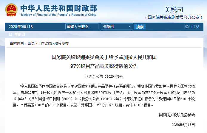 国务院关税税则委员会 关于给予孟加拉人民共和国 97%税目产品零关税待遇的公告 税委会公告〔2020〕5号 按照我国给予同中国建交的最不发达国家97%税目产品零关税待遇的承诺,根据我国与孟加拉人民共和国换文情况,自2020年7月1日起,对原产于孟加拉人民共和国的97%税目产品,适用税率为零的特惠税率。 97%税目产品为《中华人民共和国进出口税则(2020)》(税委会公告〔2019〕9号)特惠税率栏中标示为“受惠国LD”的5161个税目,“受惠国1LD1”的2911个税目,以及“受惠国2LD2”的184个税目,共计8256个税目。 国务院关税税则委员会 2020年6月16日 如: