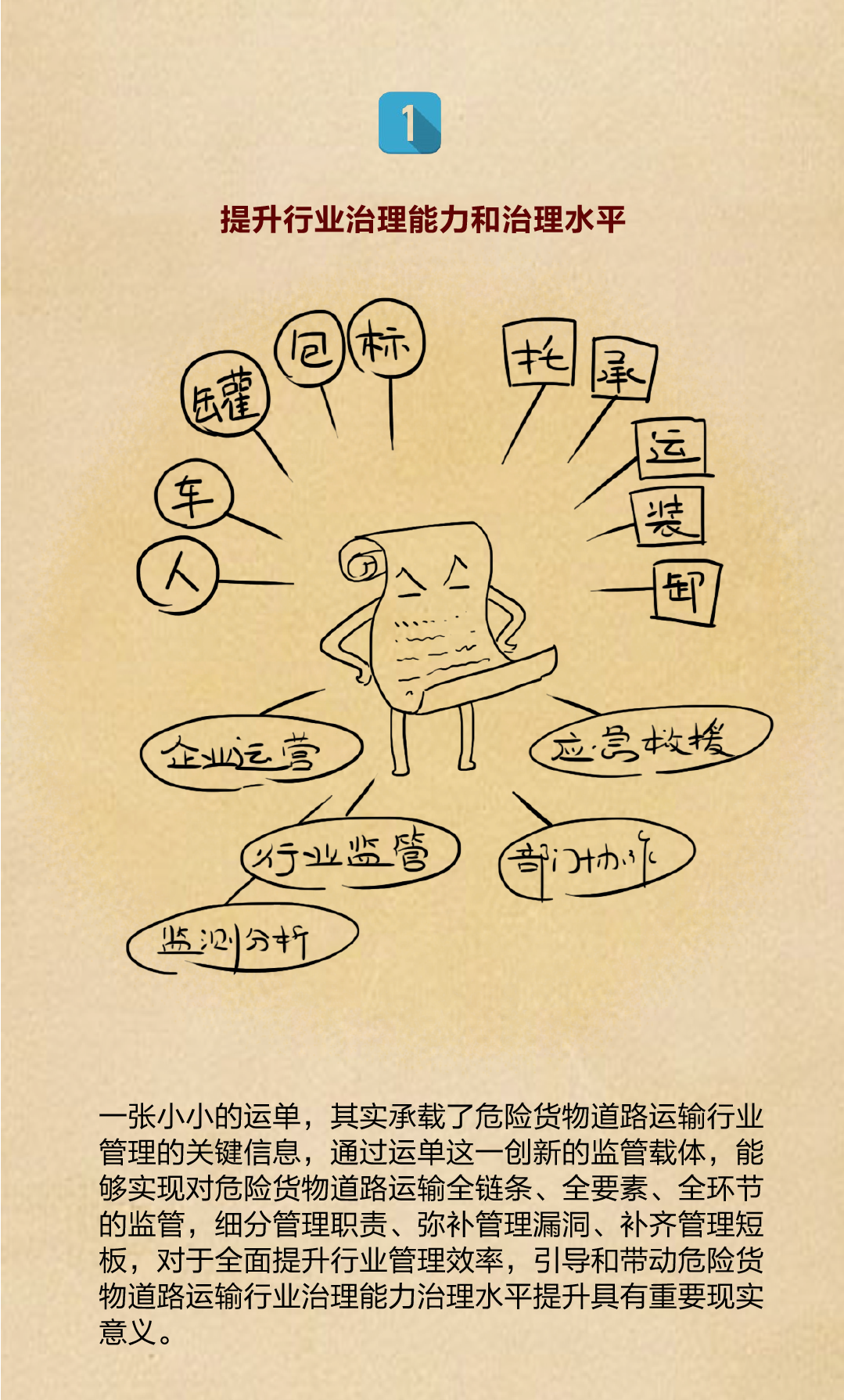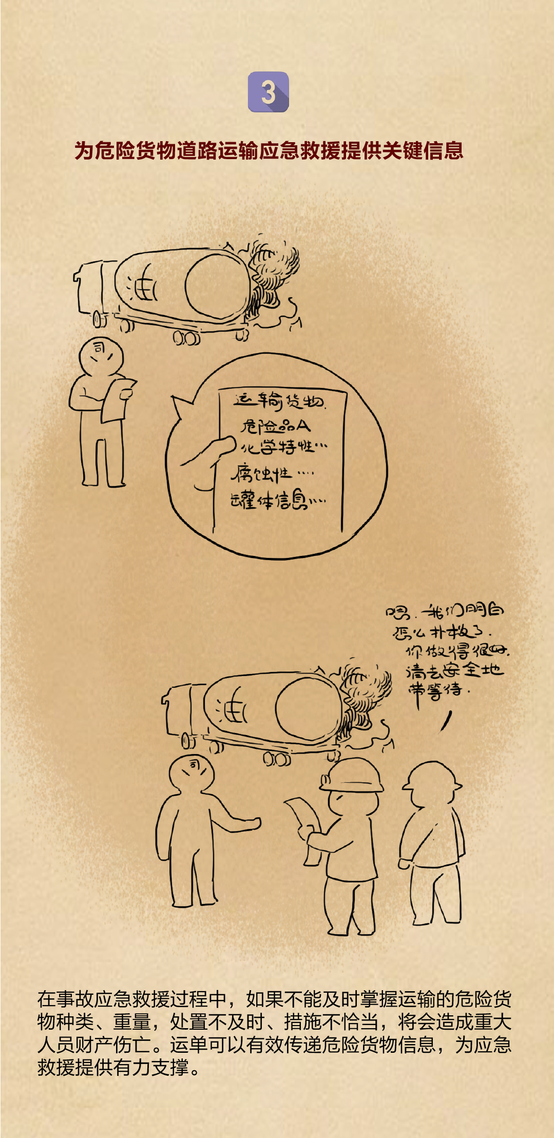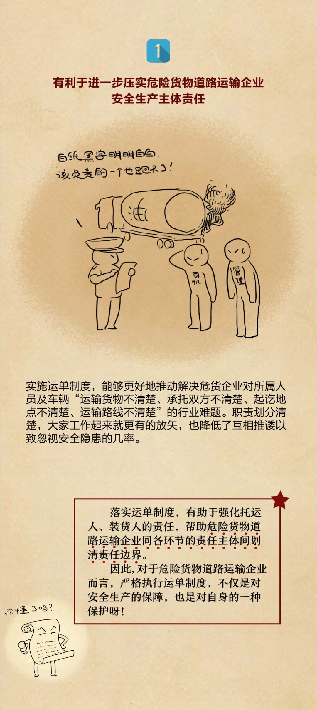 危险货物道路运输管理环节这么多 为什么要把“运单”放在突出位置 着力加以推进呢? 一 首先,运单制度对危险货物道路运输安全管理有非常实际的促进作用! 小小一张运单,串联了危险货物道路运输的多个环节,承载了行业管理的关键信息。落实危险货物道路运输运单管理制度,对于约束承托双方行为,建立全链条安全监管闭环,保障运输安全具有重要作用。 二 除了更好地保障安全生产,危险货物道路运输运单还有更加重要的使命哦! 为严格落实危险货物道路运输运单管理制度,交通运输部今年4月印发了《关于加强危险货物道路运输运单管理工作的通知》,在危险货物运输管理领域全面推行运单管理制度。通过运单这一创新的监管载体,把托、承、装、运、卸多个环节串起来,把人、车、罐、包、标等多个要素连起来,把企业运营、行业监管、部门协作、应急救援、监测分析各项工作合起来,实现对危险货物全链条、全要素、全环节的监管,细分管理职责、弥补管理漏洞、补齐管理短板,提升安全监管水平。 按照通知要求,2020年10月完成全国范围电子运单数据跨省联网共享技术调试,力争在2021年1月1日以前全面实现辖区内危险货物道路运输运单电子化。