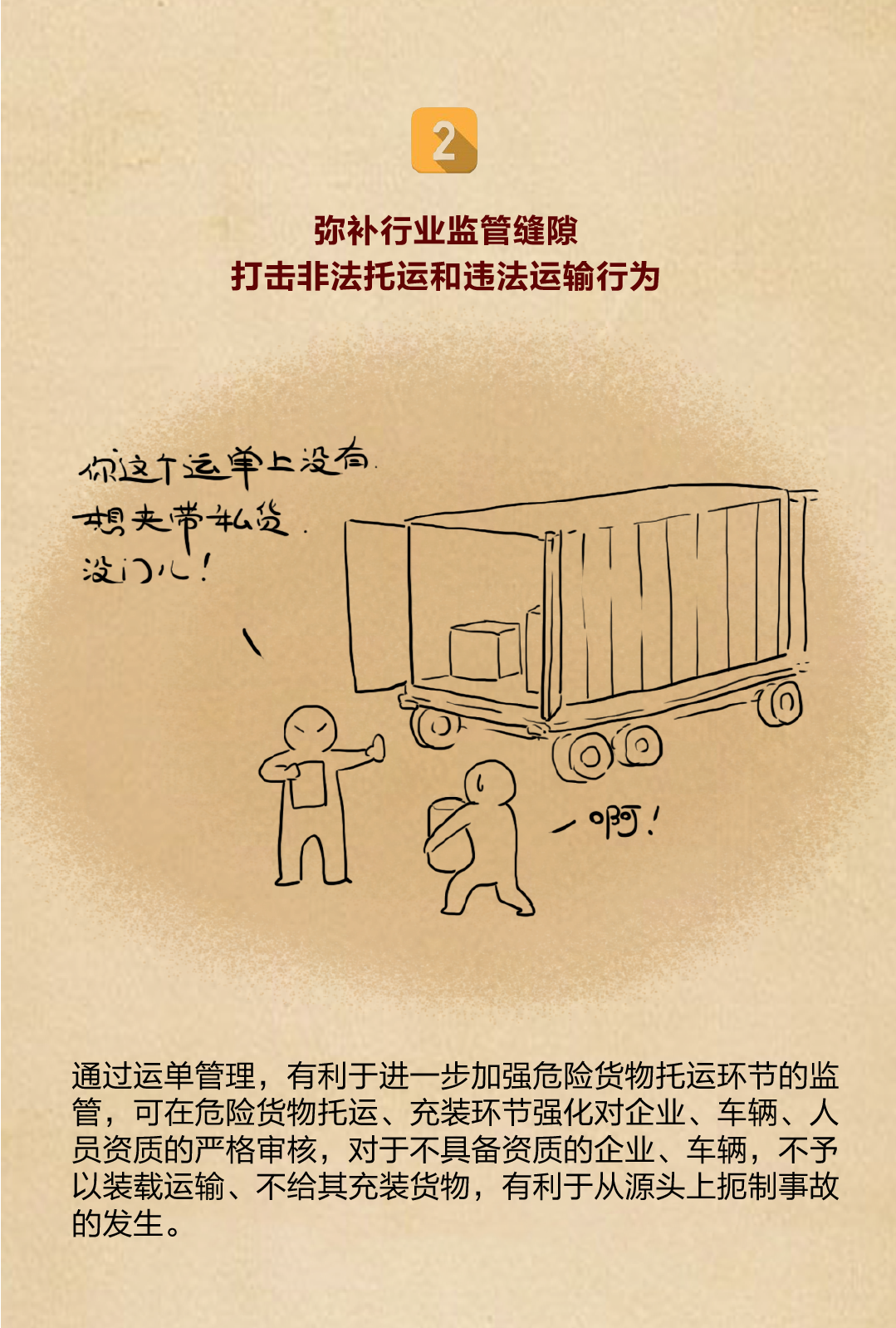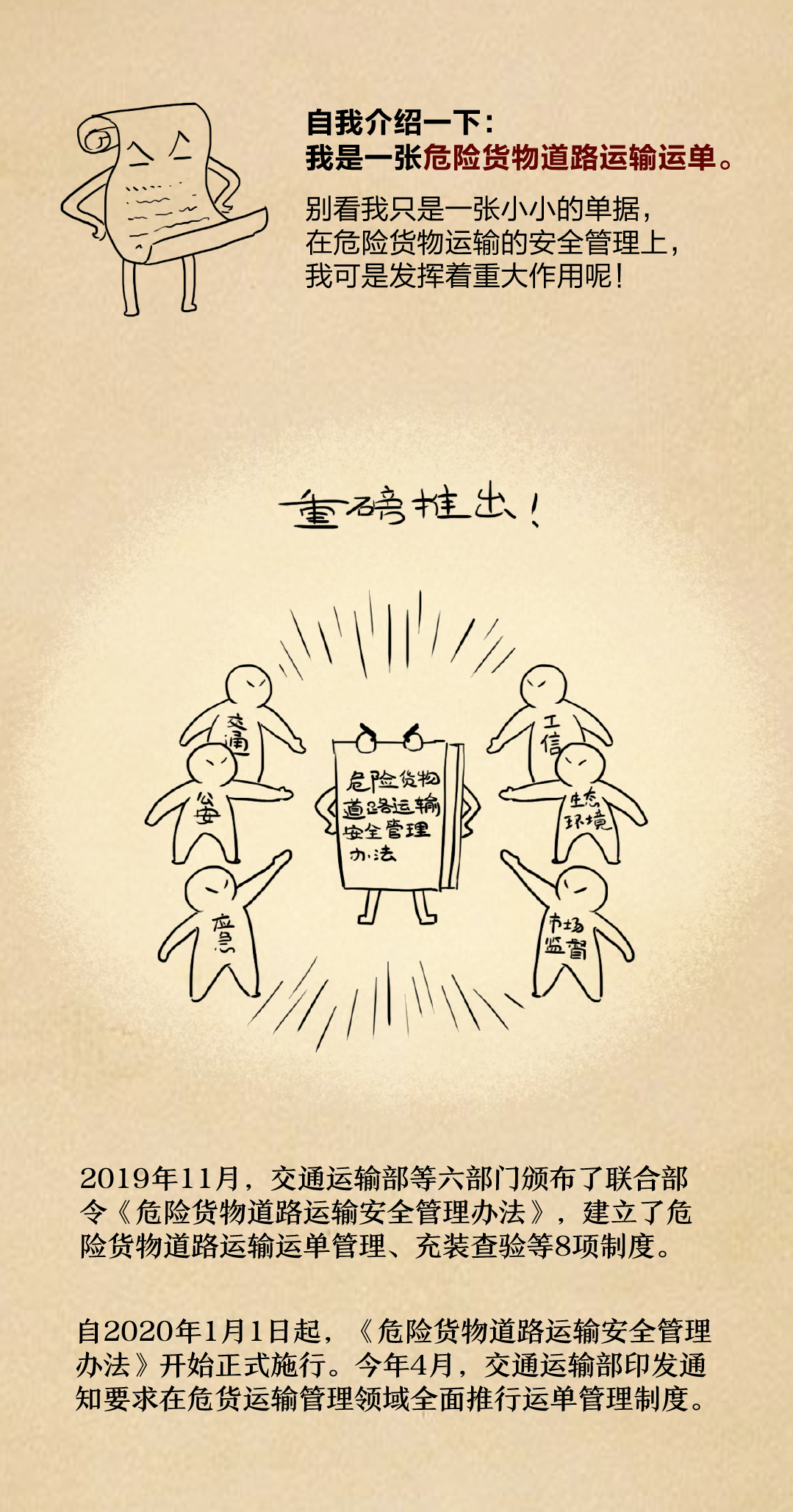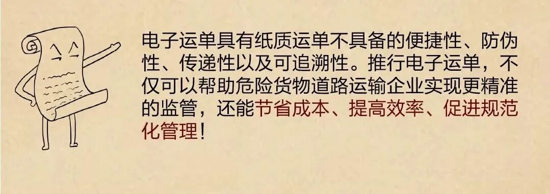 危险货物道路运输管理环节这么多 为什么要把“运单”放在突出位置 着力加以推进呢? 一 首先,运单制度对危险货物道路运输安全管理有非常实际的促进作用! 小小一张运单,串联了危险货物道路运输的多个环节,承载了行业管理的关键信息。落实危险货物道路运输运单管理制度,对于约束承托双方行为,建立全链条安全监管闭环,保障运输安全具有重要作用。 二 除了更好地保障安全生产,危险货物道路运输运单还有更加重要的使命哦! 为严格落实危险货物道路运输运单管理制度,交通运输部今年4月印发了《关于加强危险货物道路运输运单管理工作的通知》,在危险货物运输管理领域全面推行运单管理制度。通过运单这一创新的监管载体,把托、承、装、运、卸多个环节串起来,把人、车、罐、包、标等多个要素连起来,把企业运营、行业监管、部门协作、应急救援、监测分析各项工作合起来,实现对危险货物全链条、全要素、全环节的监管,细分管理职责、弥补管理漏洞、补齐管理短板,提升安全监管水平。 按照通知要求,2020年10月完成全国范围电子运单数据跨省联网共享技术调试,力争在2021年1月1日以前全面实现辖区内危险货物道路运输运单电子化。