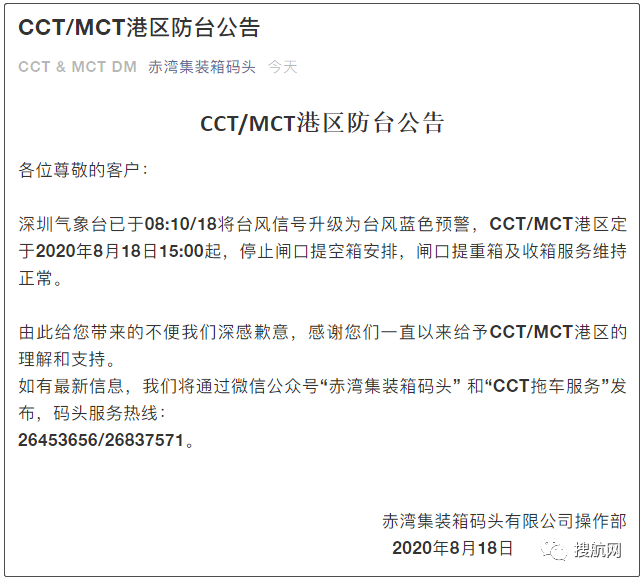 赤湾集装箱码头CCT/MCT港区定于2020年8月18日15:00起,停止闸口提空箱安排,闸口提重箱及收箱服务维持正常。