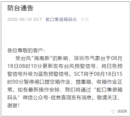 受台风"海高斯"的影响,深圳市气象台于08月18日08时10分更新发布台风预警信号,将白色预警信号升级为蓝色预警信号。蛇口集装箱码头SCT将于08月18日15时00分暂停闸口提空箱作业,提重箱、收箱作业正常。