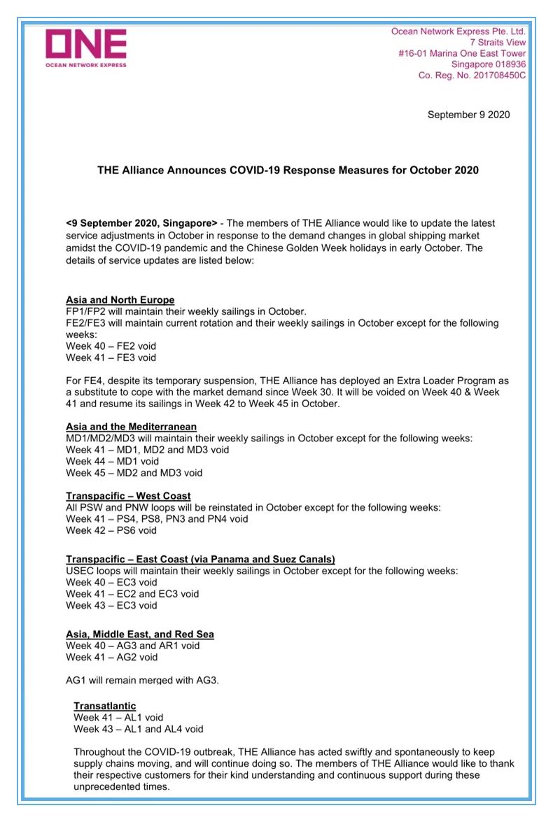 “十一”黄金周临近,继2M联盟公布黄金周停航计划后后,THE联盟也宣布,将在10月份取消更多航次。请提前、合理安排出货事宜。