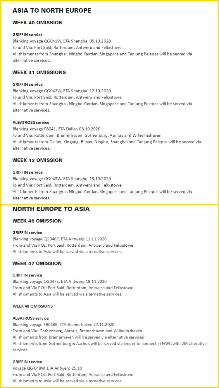 Sea-Intelligence Consulting首席执行官Lars Jensen表示,班轮公司从以往教训中明白,运力管理是面对需求下降时保持运价坚挺的有效手段。“在第二季度疫情暴发的高峰期,承运人迅速撤出了运力。过去,当需求下降时,大家下意识的反应是降低运价以求填满船上的舱位。”Lars Jensen表示:“以前没有谁愿意成为第一个裁撤运力的人,而现在情形大不同了。在大家弄清楚疫情究竟如何影响行业后,不到一周就采取了行动。” 尝到自律甜头的班轮公司继续把控运力投入,已经有公司公布了十月份的停航计划,目前以亚欧市场为主。谨慎的运力管理、燃油价格的持续走低以及消费模式带动航运需求的转变,让班轮公司在低货量下依然获得了超出往年的利润。 THE联盟表示,即将到来的中国“十一”黄金周假期,以及新冠肺炎疫情带来的持续不确定性,THE Alliance成员希望在10月份调整最新的服务策略,以应对全球航运市场的需求变化,使得停航范围继续扩大。 亚洲至北欧市场 FP1/FP2航线,将在10月份保持周班的频次。 FE2/FE3航线,将在10月份保持周班的频次,但取消第40周的FE2航次,和第41周的FE3航次。 FE4航线已被暂停,但THE联盟还是从第30周开始,安排了额外的装载计划,满足市场需求。不过第40周和第41周的航次被取消,从第42周至第45周,恢复航行。 亚洲至地中海市场 MD1/MD2/MD3航线,将在10月保持周班频次,但第41周的MD1、MD2和MD3航次被取消,第44周的MD1航次被取消,第45周的MD2和MD3航次被取消。 远东至美国西海岸市场 所有PSW和PNW航线将在10月恢复,但第41周的PS4、PS8、PN3和PN4航次被取消,第42周的PS6航次被取消。 远东至美东(经巴拿马运河和苏伊士运河) USEC航线将在10月保持周班的频次,但第40周的EC3航次被取消,第41周的EC2和EC3航次被取消,第43周的 EC3航次被取消。 亚洲中东红海市场 第40周的AG3和AR1航次被取消,第41周的AG2航次被取消 AG1航线将继续与AG3航线合并。 跨大西洋市场 第41周的AL1航次被取消,第43周的AL1和AL4航次被取消。 2M联盟:马士基公布了10月黄金周期间的停航情况,目标是在接下来的几周内通过航班调整来应对需求减少的情况。 亚洲-北欧AE5和AE55航线:由于上述航次停航,鹿特丹港和不来梅哈芬港的需求将分别由AE1和AE10航线满足。此前宣布暂停运营的AE2和AE20航线将继续暂停。 远东亚洲往返印度次大陆F12航线停航通知 亚洲往返印度次大陆市场F13航线停航通知 除了即将到来的黄金周,由于持续的Covid-19疫情,新冠继续挑战集运市场,、马士基宣布了以下的停航航线: 地中海航运:亚洲往返北欧GRIFFIN和ALBATROSS航线 赫伯罗特:亚洲-北欧FE2、FE3和FE4 可选航次 亚洲-地中海MD1、MD2和MD3 可选航次 东方海外:跨太平洋市场停航计划 ● 太平洋华北1(PCN1) 靠港次序天津>青岛>上海>鲁珀特港长滩>西雅图>天津 取消于十月三日由天津出发的航次 ● 太平洋华中1(PCC1) 靠港次序:宁波>上海>釜山长滩>釜山>宁波 取消于十月十日由宁波出发的航次 ● 越南中国服务(VCS) 挂靠次序:上海>宁波>长滩>奥克兰>连云港>上海 取消于十月九日由上海出发的航次 ● 太平洋西北1(PNW1) 挂靠次序:蛇口>香港>盐田>高雄>温哥华>西雅图>釜山>高雄>蛇口 取消于十月十七日由蛇口出发的航次 ● 太平洋西北2(NW2) 挂靠次序:盐田>厦门>宁波>上海>釜山>西雅图>温哥>华盐田 取消于十月五日由盐田出发的航次 ● 太平洋西北4(PNW4) 挂靠次序:香港>盐田>宁波>上海>鲁珀特太子港>温哥华>上海>香港 取消于十月六日由香港出发的航次 ● 东岸中国2(ECC2) 挂靠次序:青岛>宁波>上海>釜山>科隆>萨凡纳>查尔斯顿>波士顿>纽约>科隆>青岛 取消于十月六日由青岛出发的航次 ● 墨西哥湾岸中国1(GCC1) 挂靠次序:香港>蛇口宁波>上海釜山>休斯顿>莫比尔>新奥尔良>迈阿密>新加坡>香港 取消于十月九日由香港出发的航次 ● 墨西哥湾岸中国2(GCC2) 挂靠次序:上海>宁波>厦门>盐田>休斯顿>莫比尔>塔穆帕>上海 取消十月四日由上海出发的航次 关于香港和华南地区2020国庆节假期期间 提单补料截止时间的安排 以下是OOCL2020国庆节假期期间的提单补料截止时间, 在此提醒您, 及时递交提单补料有助于确保目的港对货物放行的顺利操作。 华南地区国庆及中秋节假期服务时间的安排 因为今年疫情原因,现在中国出口的柜量慢慢在增加,国外进口到中国的柜量在减少,这样船公司出现了国外返程空船,亏载的情况,船公司利润下降,所以现在改成小船运载或者几个船公司共用一艘船承运。这样导致后续出现了以下情况: (1)、船期基本在同一时间,装柜时间基本在同一时间,导致拖车紧张,装箱工紧张; (2)、舱位紧张爆舱,停柜现在频繁出现 (3)、海运费持续涨价 (4)、下半年出口有可能继续出现缺空箱的情况(目前部分船公司已经出现缺空箱的情况)。 所以大家合理安排出货,提前通知安排订舱,对后续出现的现象心里有个预期和准备。 业界普遍认为,严格的运力管理,是今年在市场货量下滑的情况下,班轮公司反而获得较好收益的最大原因。因此,主要班轮公司依然继续将运力管控进行到底。运价短期内还将继续上涨!